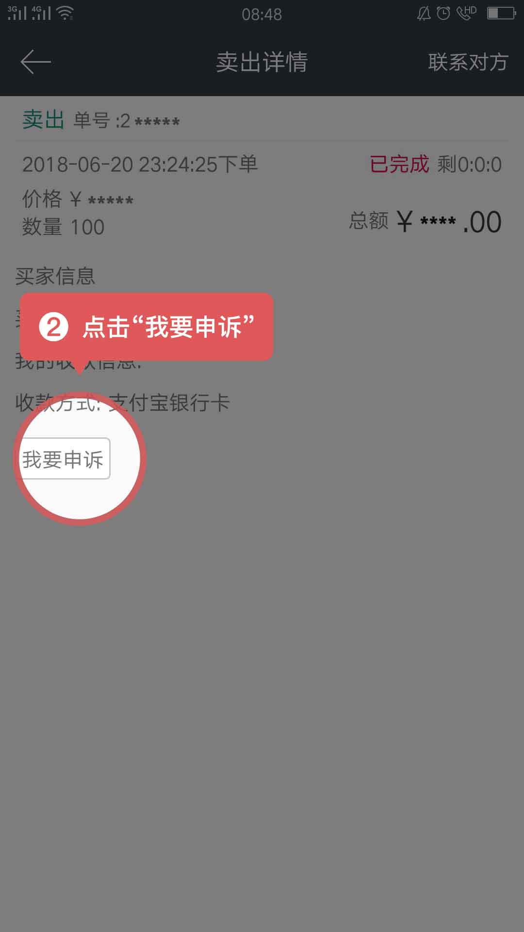 1、进入C2C交易区 — 找到有异议的订单 — 点击“查看详情” 点击左下角的“我要申诉”