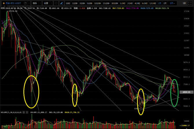 BTC历史复盘:上图3次筑底黄圈,每一次都有快速的打压呈现长长的影线,最终收盘快速拉升回来。从今天凌晨开始大家应该关注大饼是否会再次出现快速的打压出现长影线,上图绿色圈区域更应该重点关注。并温馨提醒大饼现在虽然属于空头趋势,但期货者们应该注意,现在点位完全可以让你多空双爆,建议期货交易者注意风险控制。