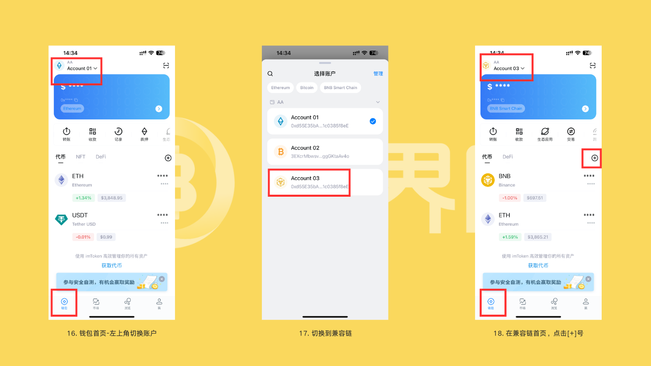 4. 基于 EVM 兼容链的 USDT,地址格式同 ETH 地址,需先在 imToken 中切换至对应 EVM 兼容链后,即可管理此类 USDT:
