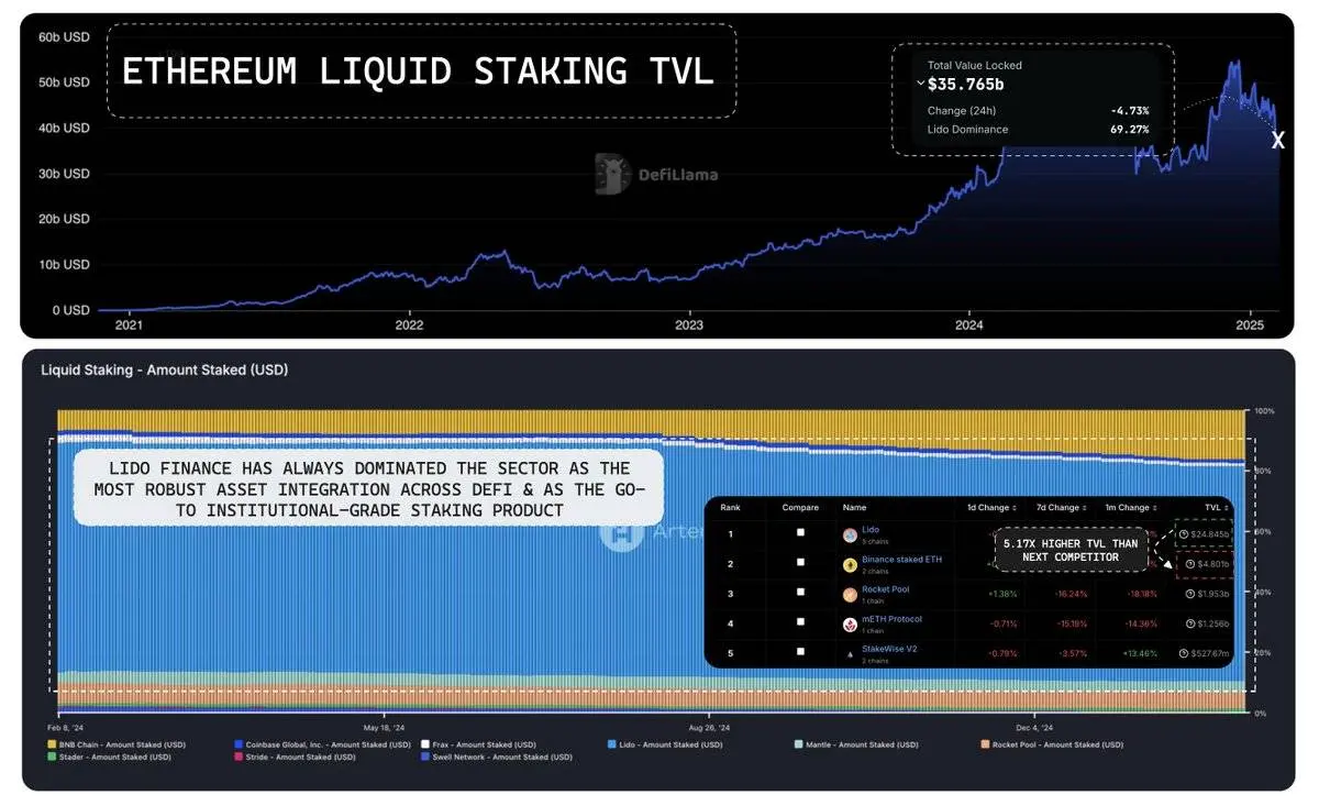 在这一赛道中,@LidoFinance 是当之无愧的领军者,占据了约 70% 的市场份额,几乎垄断了流动性质押代币(LST)市场。Lido 的 TVL 达到 248 亿美元,是其下一个竞争对手 @binance 的 $bETH(48 亿美元)的 5.17 倍。