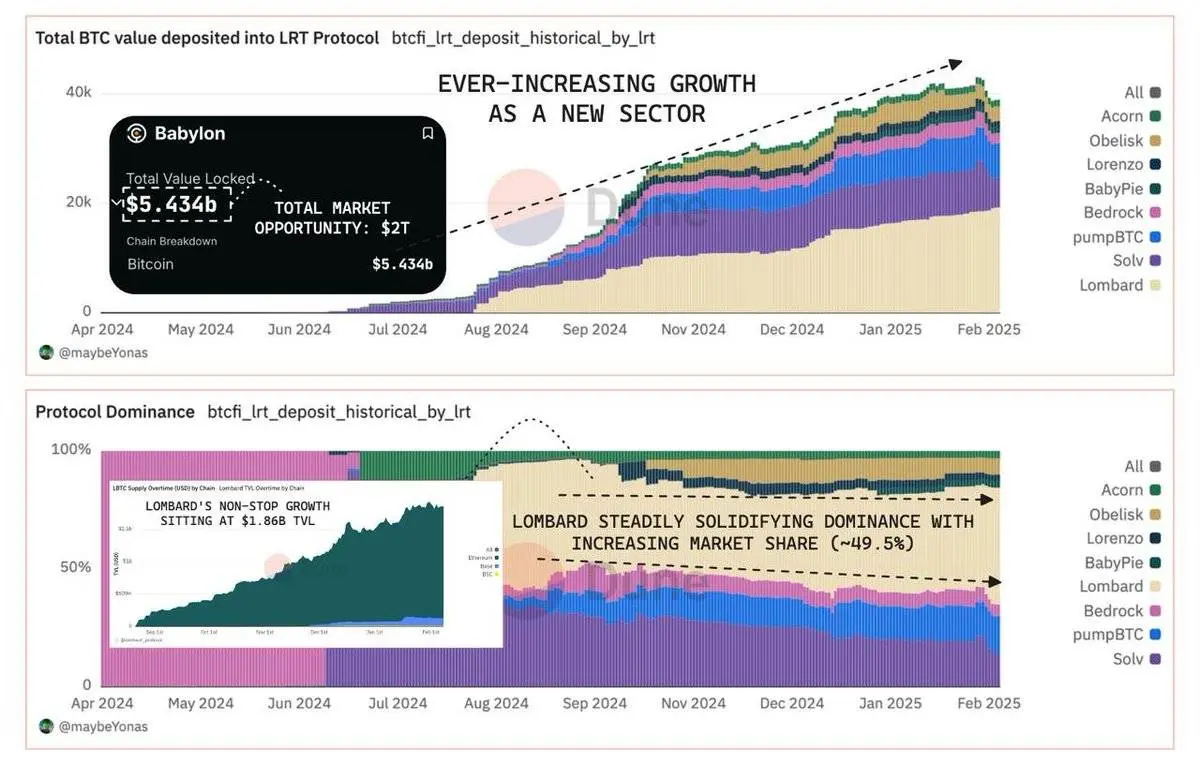 @Lombard_Finance 在 BTC-Fi 领域的表现正在逐步接近 LST(流动性质押代币)和 LRT(液态再质押代币)赛道的趋势,其市场份额稳步上升至 49.5%。
