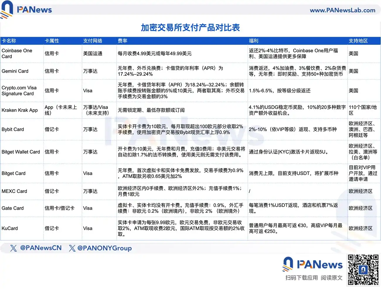 随着稳定币和支付逐渐成为本轮热门加密叙事,头部加密中心化交易平台(CEX)纷纷布局用户日常消费支付的赛道,围绕加密信用卡、借记卡以及 App 支付的生态布局愈发激烈。从 Coinbase、Gemini、Crypto.com,到 Kraken、Bybit、Bitget、Gate、KuCoin 等,各大交易平台纷纷推出或升级支付产品,争夺加密资产与现实世界的连接通道。多数加密支付卡支持欧洲经济区、美国等主要市场,多家平台提供 2%-10% 的加密返现福利。本文, 将对这些交易平台最新推出的加密支付卡或支付 app 进行介绍。