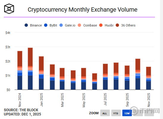11月,全球加密货币现货交易量环比 暴跌26.7%,总额骤降至1.59万亿美元,创下自2025年6月以来的数月新低。这一数据清晰地表明,在经历了第三季度的活跃与10月的相对高位后,市场的交易动能已 显著萎缩。
