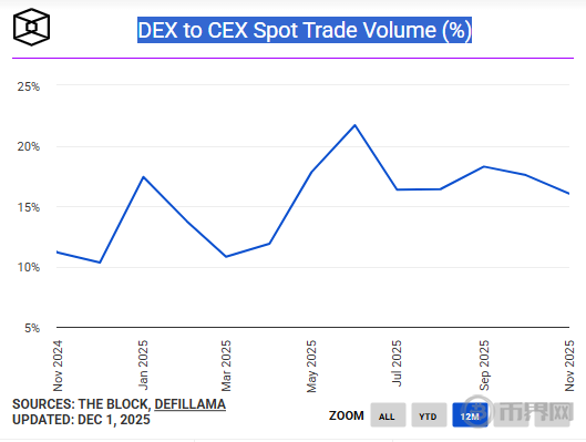 在市场整体遇冷的同时,交易发生的场所结构也在发生微妙变化。11月,去中心化交易所与中心化交易所的交易量比率从10月的 17.56%进一步下降至15.73%。