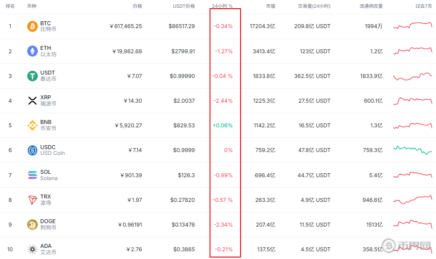 抛售潮迅速波及整个市场。以太坊价格跌破2,800美元,日内跌幅近10%;瑞波币、币安币、狗狗币等主流币种同样全线飘绿,24小时内跌幅普遍在6%至8%之间。这种全面性的价格下跌标志着市场已经进入普遍避险模式,而非个别币种的短期调整。