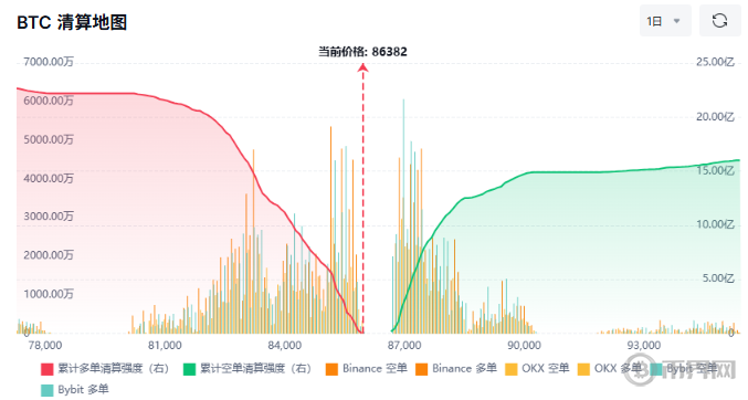 当前空单清算支撑价格回升:累计空单清算强度(绿色曲线)持续上升,对应交易所空单清算柱(如 Binance 空单)增加,表明空头在价格反弹过程中被强制平仓,释放的买盘支撑价格回升至 86382;
