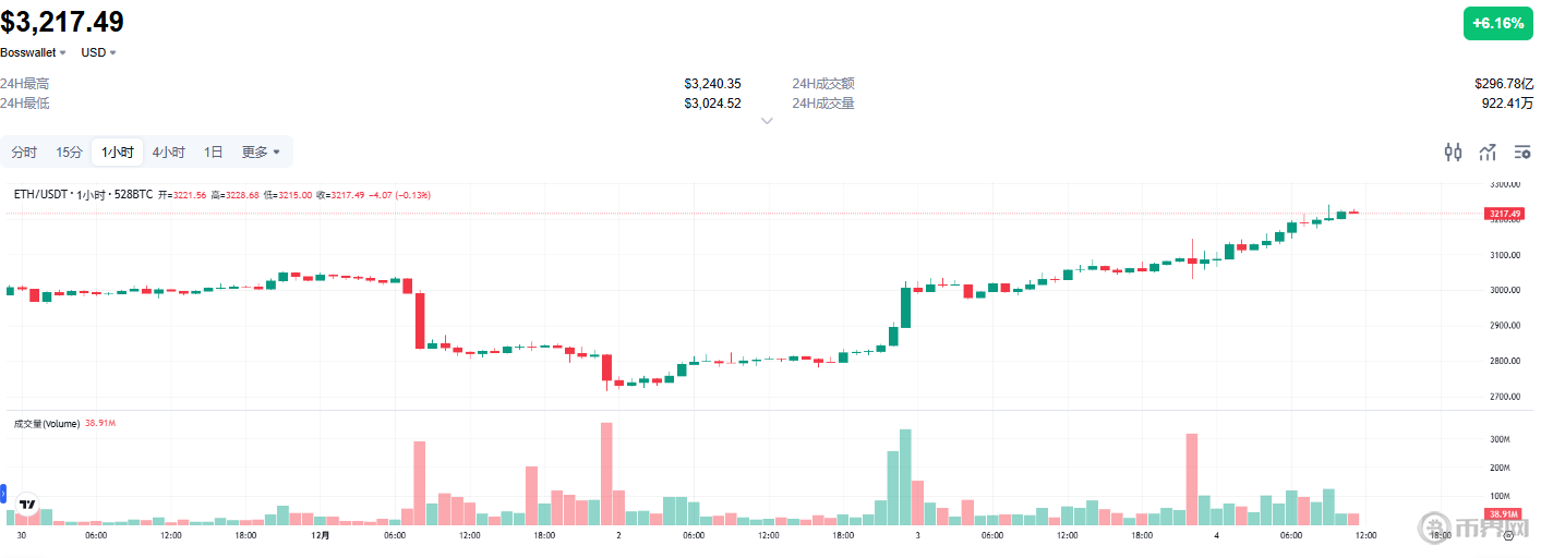 以太坊完成Fusaka升级价格突破3200美元,日涨7.3%