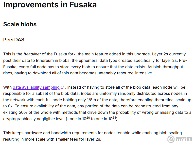 Fusaka升级的核心技术改进之一是引入了 “PeerDAS”。这是一种点对点的数据可用性采样方案,它允许节点在不下载全部数据的情况下,高效验证数据的可用性。
