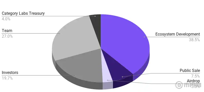 MON是Monad网络的原生功能型代币,固定总供应量为1000亿枚。其分配方案体现了长期生态建设的思路:38.5% 分配给生态发展,27% 归属于团队,19.7% 分配给投资者,7.5% 用于公开发售,其余部分用于社区激励与国库。