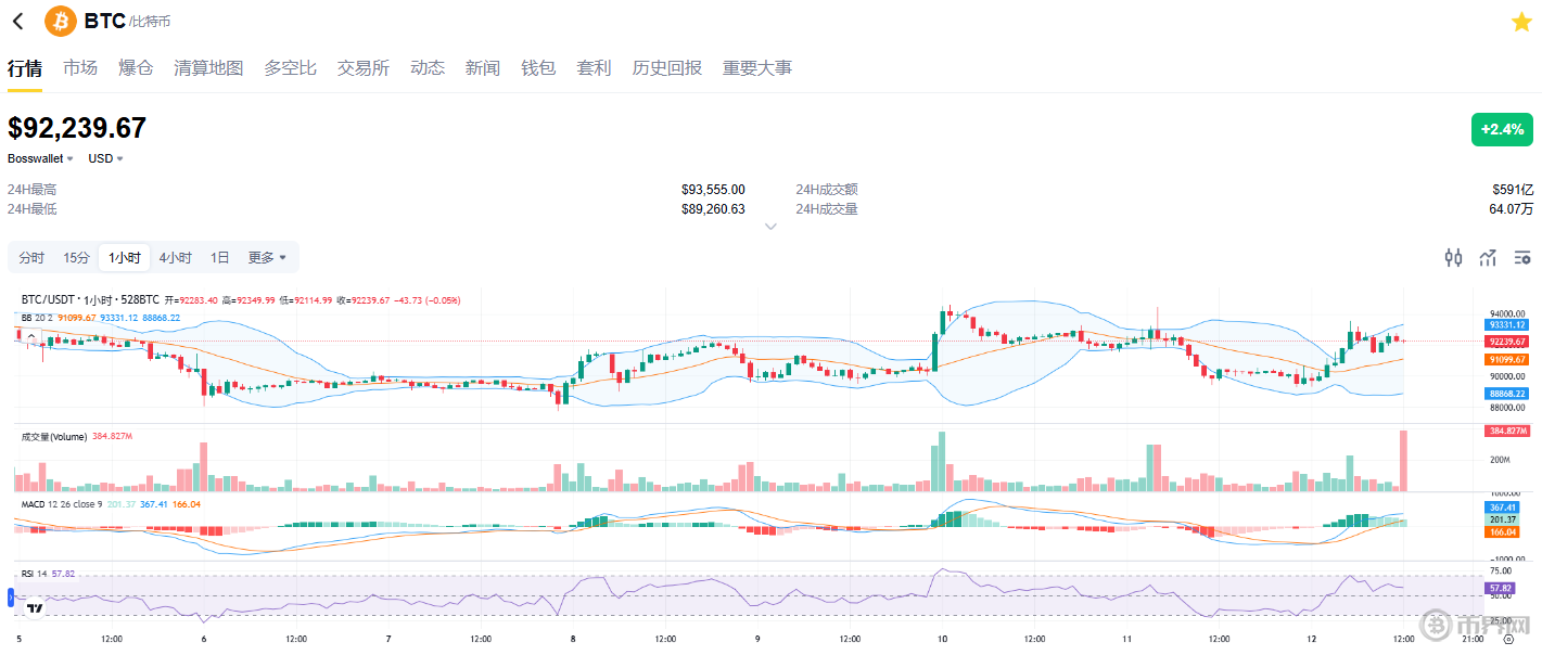 当前比特币 1 小时级别技术走势分析(价格 $92,239.67)结合布林带、MACD、RSI 及成交量,呈现 “震荡偏强的整理格局”: