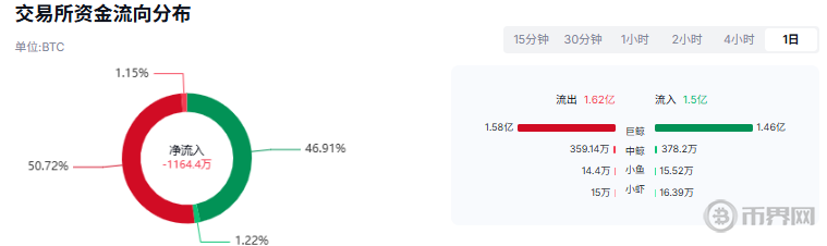 当前比特币交易所 1 日资金呈净流出状态(净流出 1164.0 万 BTC),核心特征如下: