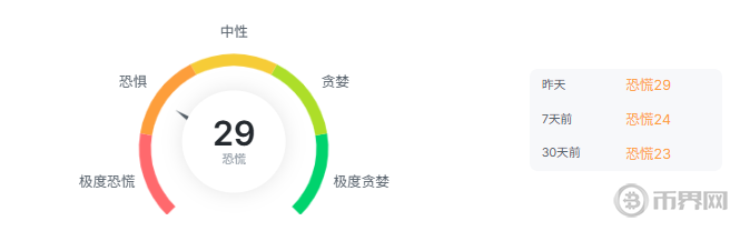 从趋势看:近 30 天(23)、7 天前(24)到当前(29),情绪始终处于恐惧区间,虽数值小幅回升(从 23 到 29),说明谨慎情绪有轻微缓和,但未脱离消极状态。