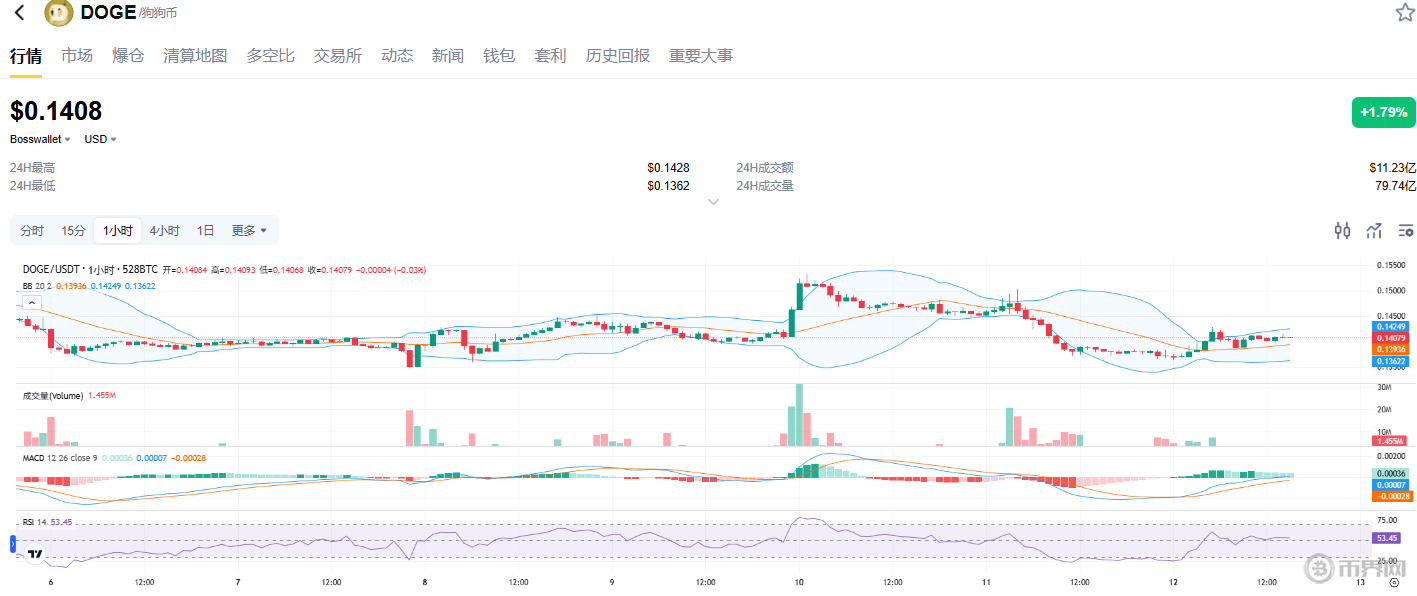 从具体数据看,2025年12月狗狗币价格已从10月约0.26美元的高位显著回调。关键支撑位在0.133-0.147美元区间,而上方阻力则密集分布于0.150-0.155美元区域。结合布林带、MACD、RSI 及成交量,呈现 “冲高后温和震荡调整” 的特征: