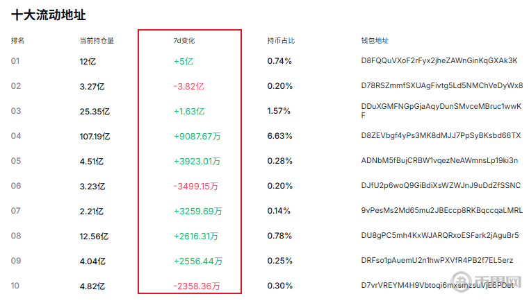 当前狗狗币十大持币地址的持仓变化,对价格呈现 “偏支撑、短期抛压有限” 的影响: