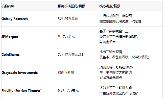 表:主要机构对比特币2026年的价格预测