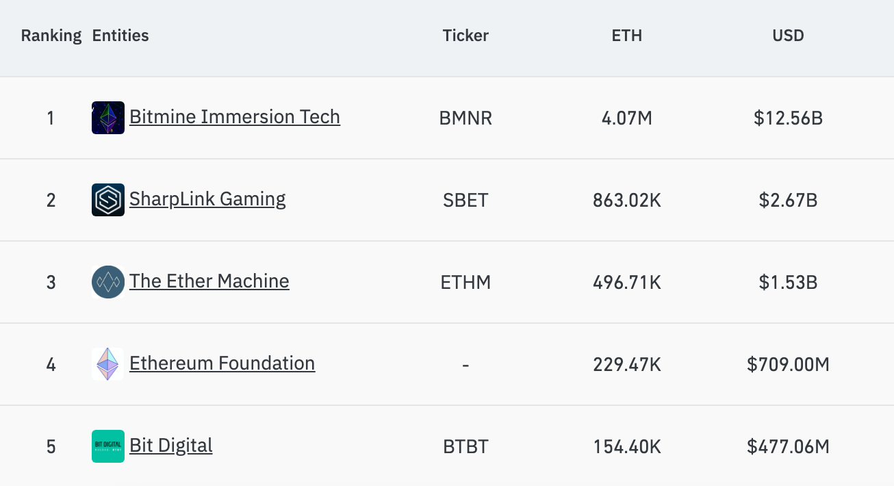 目前,以太坊生态已出现 4 家类微策略企业,包括:BitMine Immersion、Sharplink Gaming、The Ether Machine、Bit Digital。