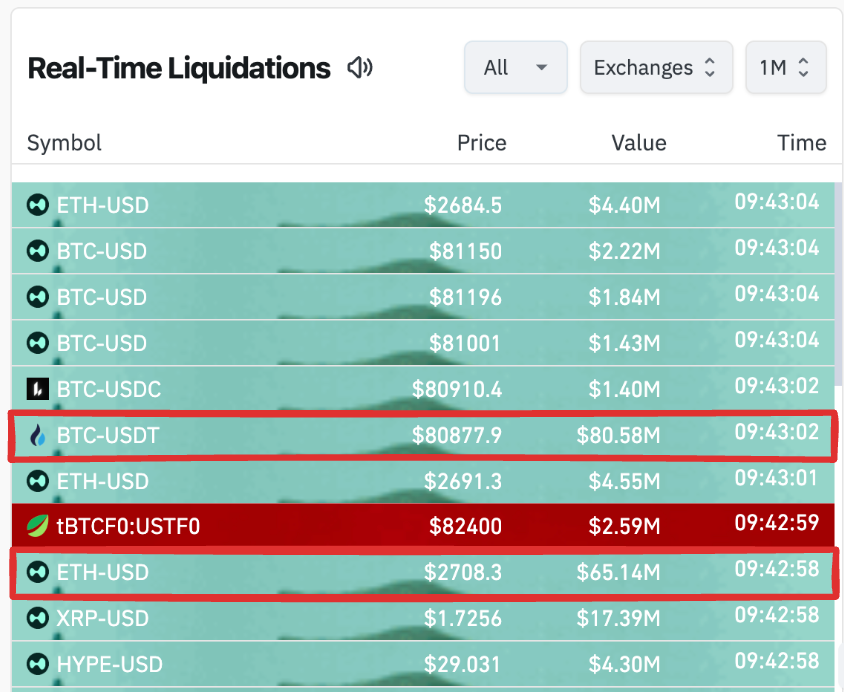 市场剧烈波动导致杠杆交易者惨遭血洗。据Ai姨数据,今日BTC 插针至 $81118,ETH 插针至 $2689,两个合约地址累计爆仓 1.46 亿美元,占到过去 24 小时总爆仓价值的 8.4%: