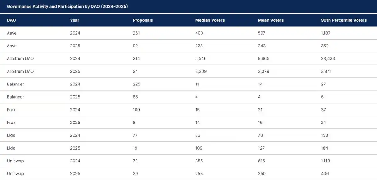 2025 年,各大主要 DAO 的提案数量和投票参与人数均大幅下降。然而,每个提案背后的投票权依然强劲。
