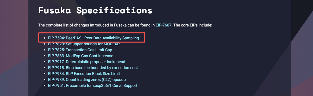 到了 2025 年底,Fusaka 升级正式在主网激活,引入 PeerDAS(Peer Data Availability Sampling)。这意味着: