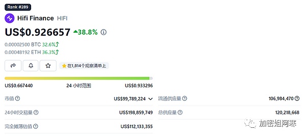 Hifi Finance是运行在以太坊网络上的一个借贷协议项目,提供加密货币抵押借贷、NTF抵押借贷和RWA服务等产品。该项目的当前市场流通市值大约为9978万美元,流通量占总供应量比值约为88%,24小时现货交易量为1.98亿美元。