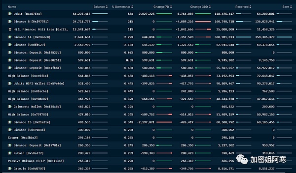 据数据显示,HIFI代币的持仓情况显示在Upbit交易所的钱包内的代币数量最多,占比超过了55%(其中部分未标记的钱包也属于Upbit交易所的钱包)。币安交易所排名第二,持有约29%的代币。另外,项目方持有11%的代币。