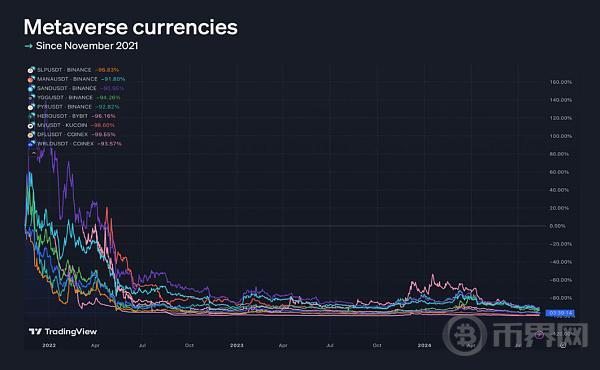 这种衰退并不只是个别项目的问题,整个元宇宙Crypto领域都大幅缩水,其总市值从500亿美元降至160亿美元。