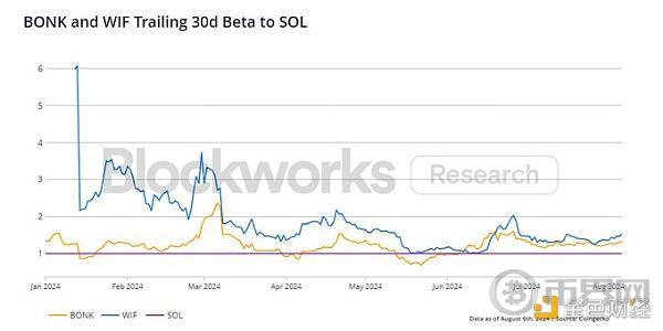 然而,尽管散户乐于追逐 memecoin 波动性,但机构仍处于观望状态。但可能可以制定高级策略,通过这些代币相对于 gas 资产的 beta 速度来交易它们(例如 WIF 到 SOL)。