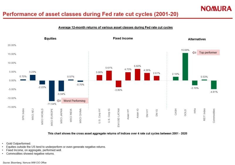 野村证券的下图显示了基于美联储前几个降息周期(2001-20)指数总回报的资产类别的表现。以黄金为首的另类投资表现最佳,而股票表现最差。