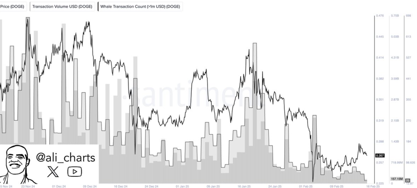 链上的数据表明,巨大的Dogecoin交易急剧下降。这表明鲸鱼在网络上不再活跃。