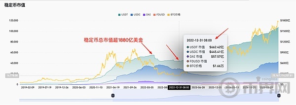 USDT+USDC总市值从 300亿 → 1200亿(+300%)