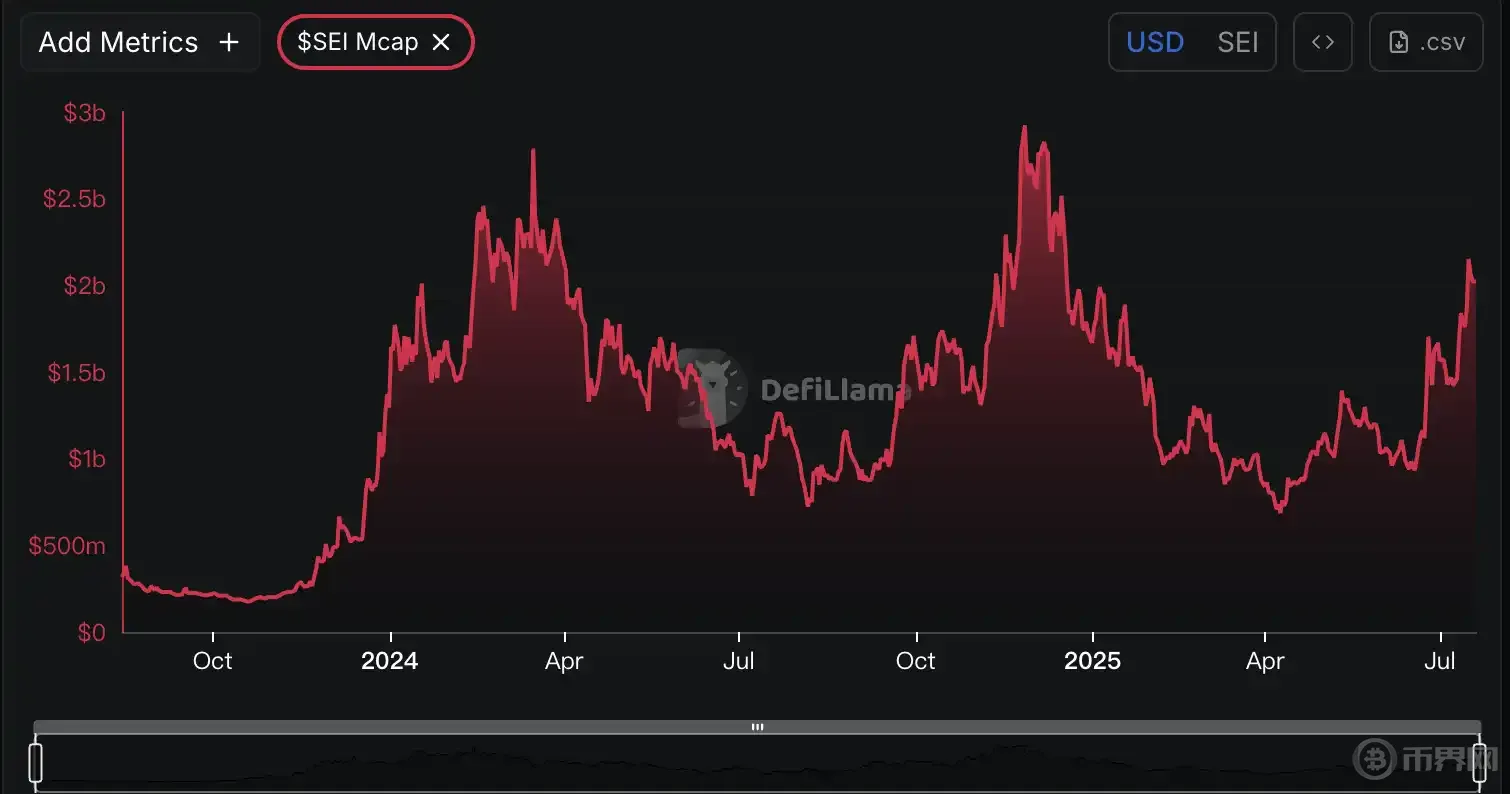 最后是 市值(Market Cap)走势:Sei 代币从 2023 年末不足 3 亿美元的市场估值,开始了持续反弹。2024 年初伴随首轮生态空投和主网上线,市值迅速飙升至 18 亿美元;随后虽有阶段性回调,但始终保持在 10 亿美元以上的支撑位。2025 年 3 月,随着更多机构投资者和合规投资工具的介入,市值再度攀升至 28 亿美元高点,而近期同样在 20–25 亿美元区间震荡上行。这种在 TVL、交易量与市值三条曲线上的同步增长,充分证明了 Sei 作为一条高性能 Layer-1 公链,正吸引着从散户到机构的多层次流动性,生态持续壮大、价值不断兑现。