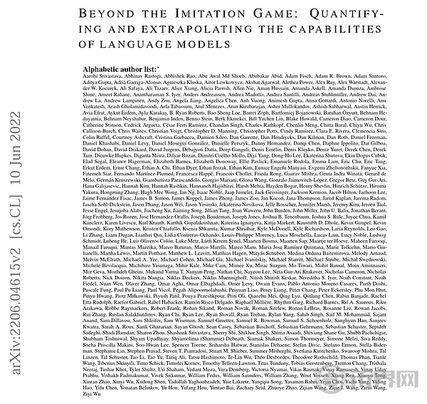 Beyond The Imitation Game: Quantifying And Extrapolating The Capabilities Of Language Models论文首页,密密麻麻地列举了132个机构的442位作者,感谢这些在人类前沿领域不断探索的人们。
