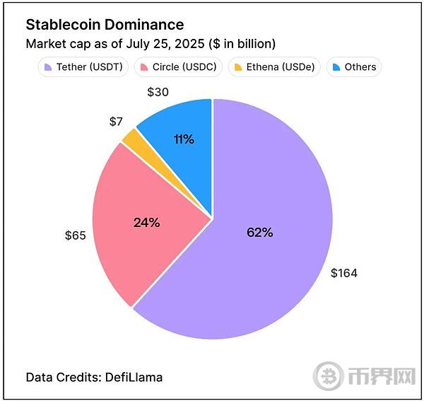 截至 7 月 25 日,Tether 在稳定币行业的主导地位已降至 61.76%,自 2024 年 11 月的 69.69% 下降了八个百分点。同期,Circle 的市场份额增加了四个百分点,达到 24.44%。