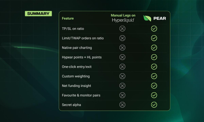 Pear 使高级策略变得简单、适合移动设备且资本高效——无论您是交易 HYPE/SOL 还是使用 beta 加权逻辑构建自定义 ETH/BTC 交易。