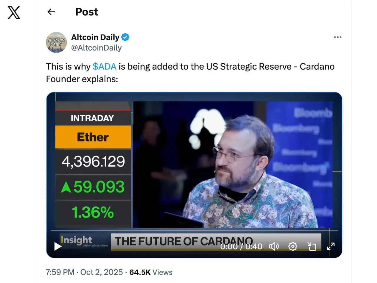Cardano (ADA) 也被列为2026 年前最值得购买的山寨币,并被纳入美国政府的数字资产储备计划。