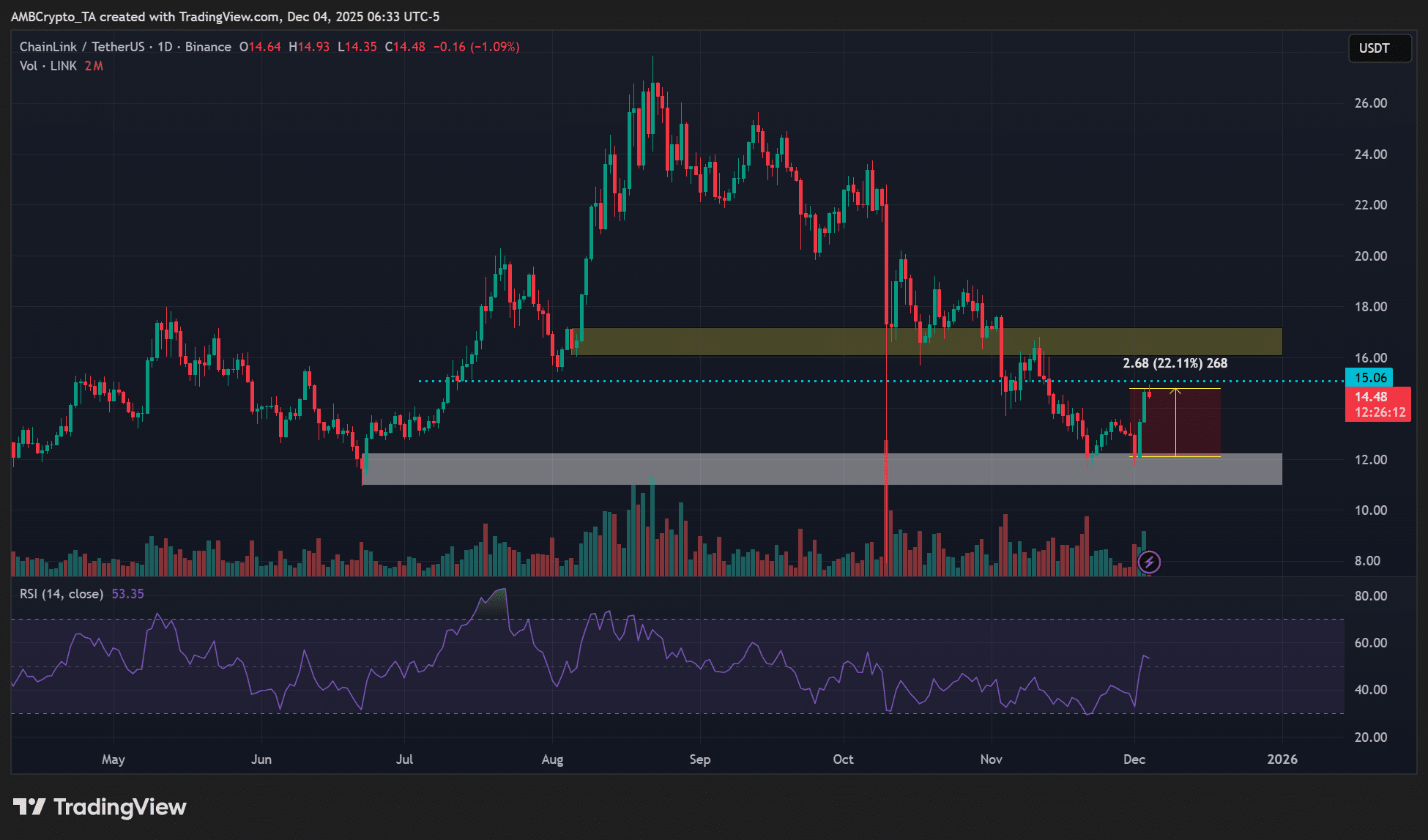 - LINK价格图表上的持续反弹可能取决于能否果断地重新站上16美元的关口。