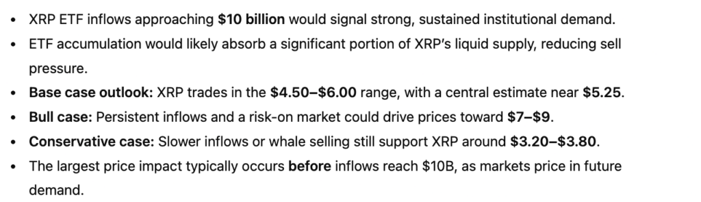 基于这些因素,ChatGPT 的最终预测是,如果 ETF 资金流入达到 100 亿美元,XRP 的价格将在 5.25 美元左右;在正常的市场条件下,波动性可能会使价格保持在 4.50 美元至 6.50 美元的较大范围内。