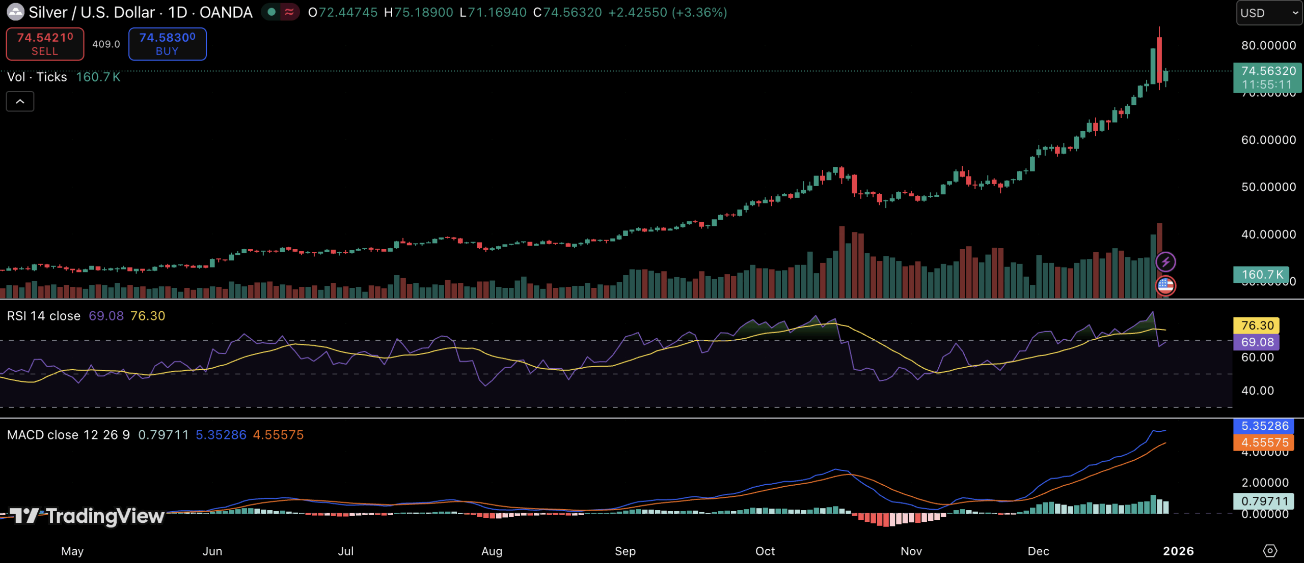 流动性这并非基本面恶化,而是突发事件。- 白银在经历了一次由流动性驱动的急剧下跌后出现反弹,从 83 美元附近暴跌至 74.62 美元左右。