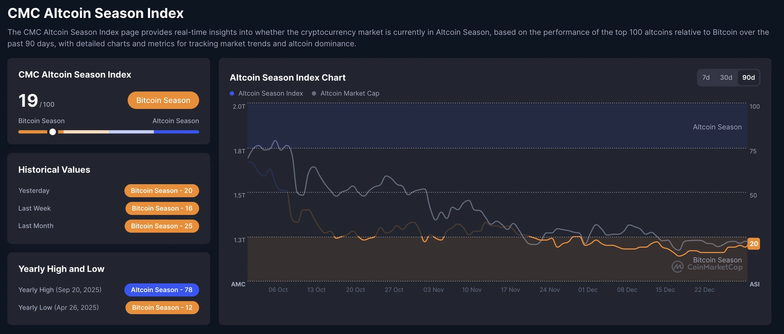 简而言之,比特币继续主导加密货币市场,这种现状可能会持续到 2026 年初。