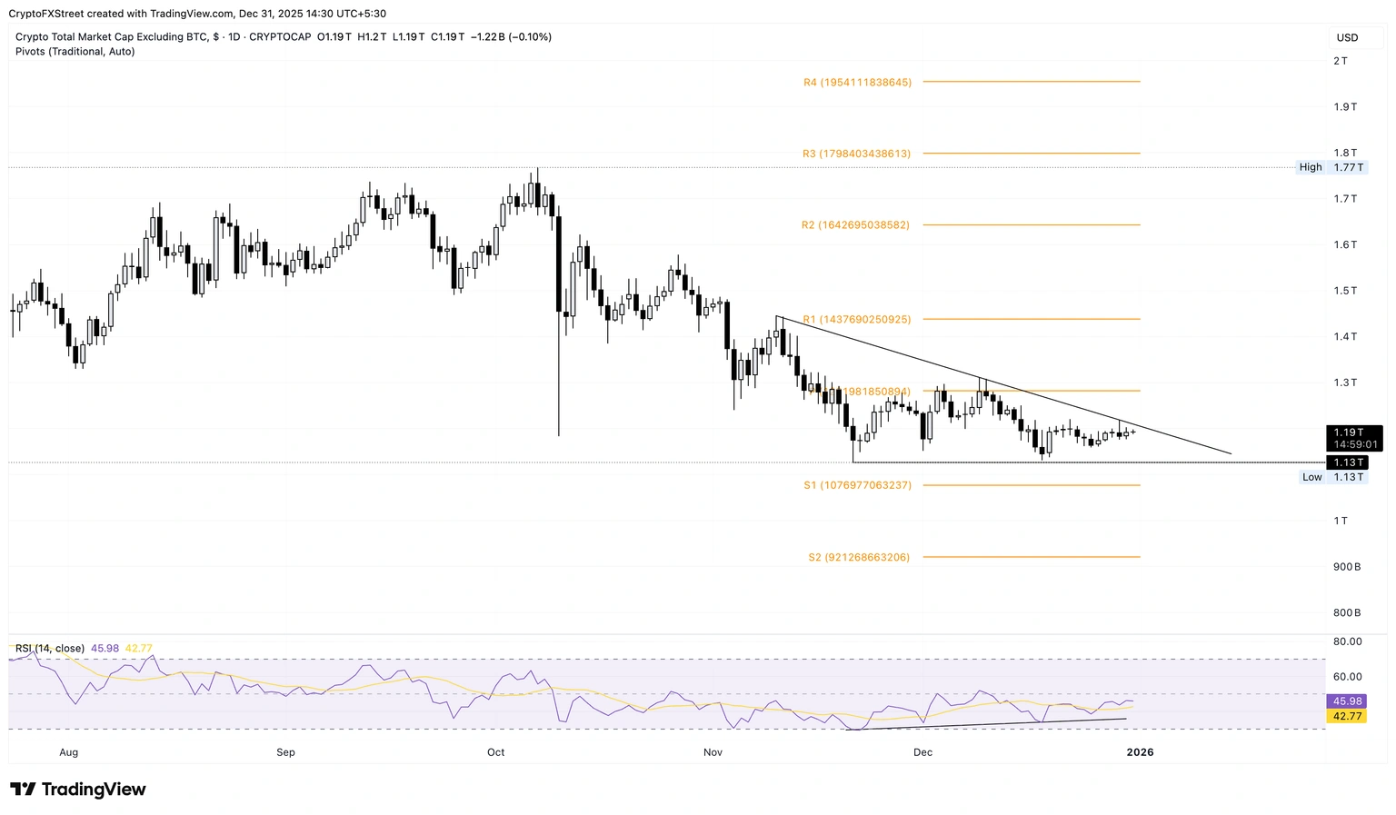 如果 TOTAL2 超过 1.22 万亿美元附近的上方趋势线,则可能扭转下跌趋势,并瞄准 1.98 万亿美元的 R1 枢轴点。