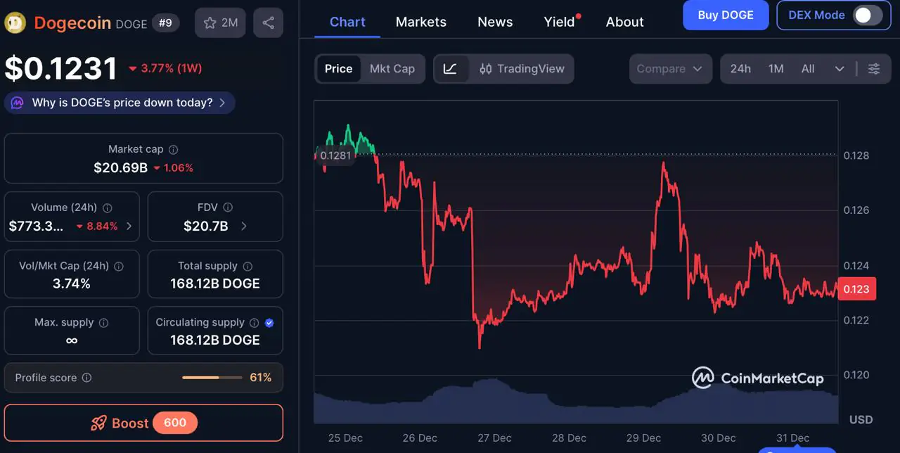 过去七天,狗狗币下跌了近 4%,跌破了 0.128 美元的阻力位,并进入了较低的交易区间。