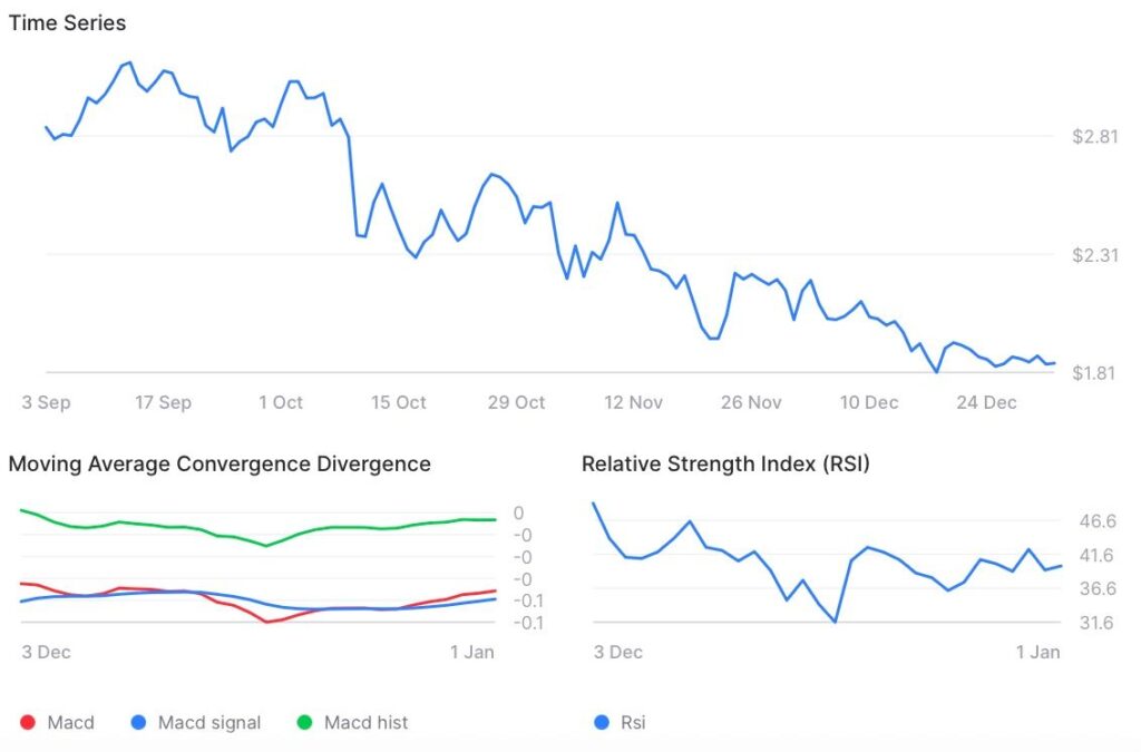 目前,XRP交易价格接近1.84美元,延续了自9月初以来的持续下跌趋势。这一大范围趋势为最新的市场信号提供了重要的背景,因为自去年底未能守住2.80美元区域以来,该代币一直难以吸引持续的需求。