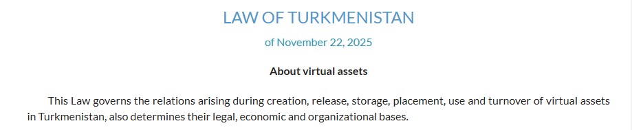 数字资产框架源自《虚拟资产法》,该法由总统谢尔达尔·别尔德穆哈梅多夫于2025年11月28日签署,并定于2026年1月1日生效。它为土库曼斯坦的加密货币建立了首个清晰的法律框架,并将所有相关活动置于中央银行的监管之下。