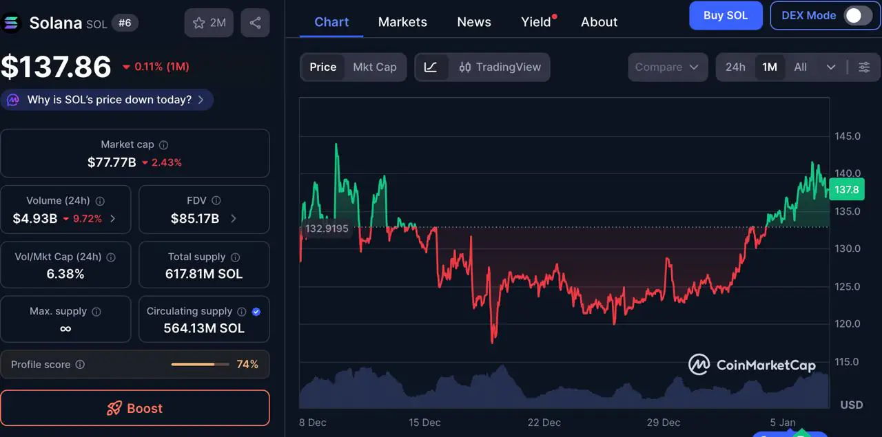 过去一个月,Solana价格经历了大幅回调,回落至120-125美元区间,买家在此入场并构筑了清晰的底部。价格从该支撑区域强劲反弹,突破了135美元附近的阻力位,目前在138美元附近盘整。