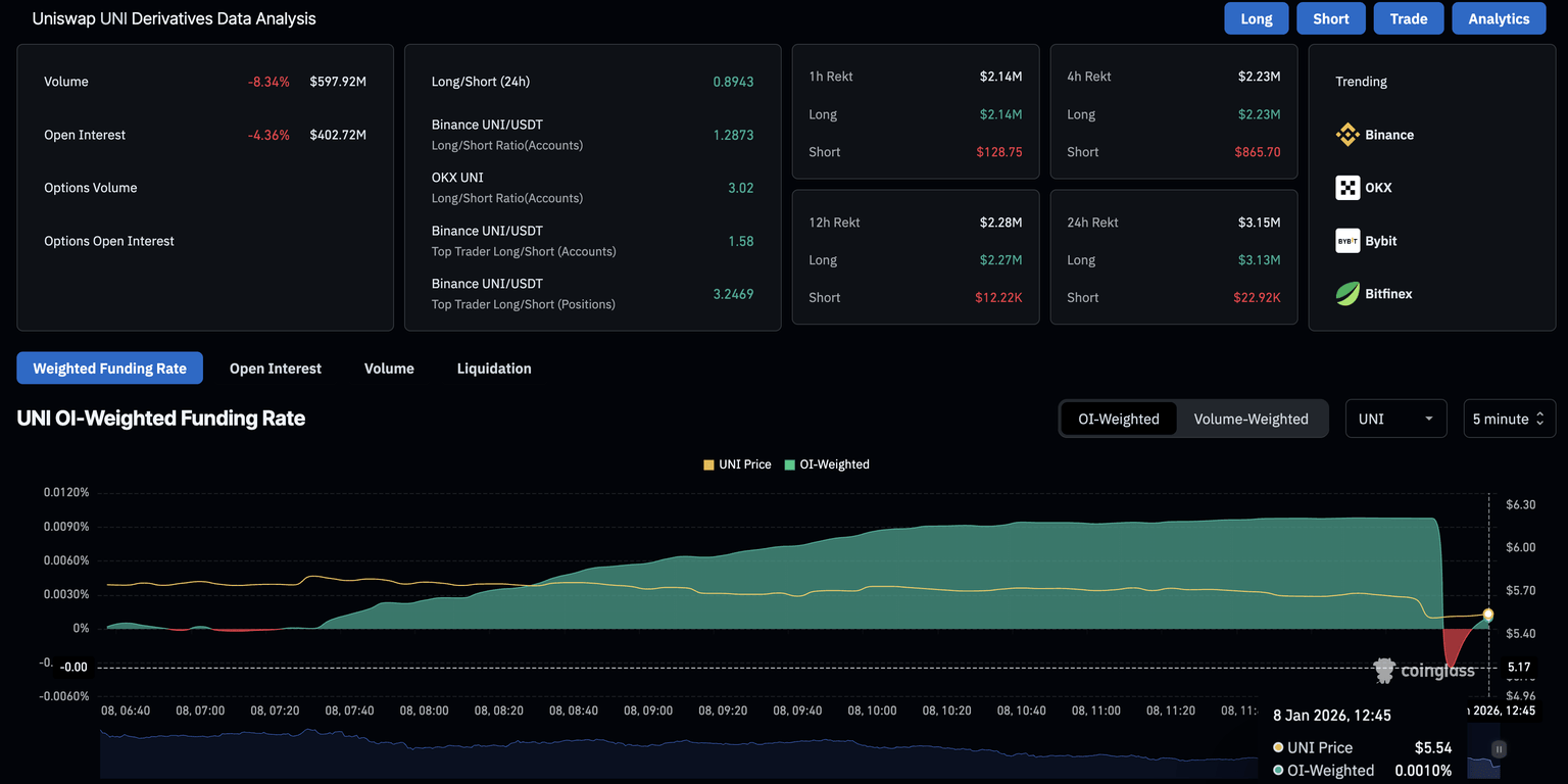 衍生品方面,CoinGlass数据显示,UNI期货未平仓合约(OI)在过去24小时内下降了4.36%,至4.0272亿美元。这表明交易员正在通过平仓或减持来限制风险敞口。杠杆作用.