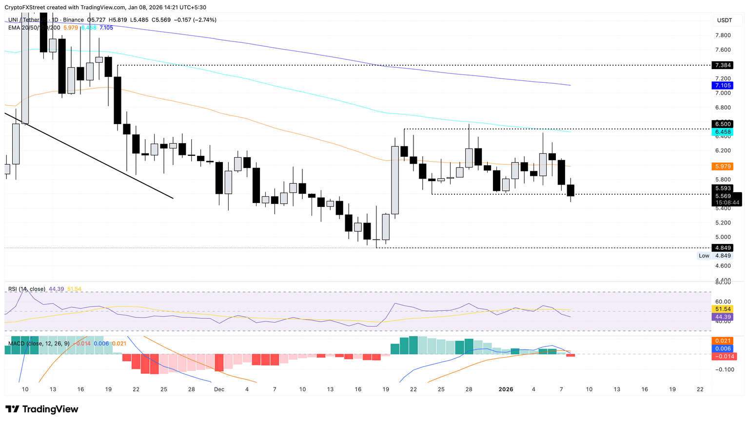 Uniswap 连续三天下跌,日线图上的技术指标也随之转为看跌。相对强弱指数 (RSI) 为 44,跌破中线并逼近超卖区域。这表明抛售压力不断增加,下行风险也随之上升。