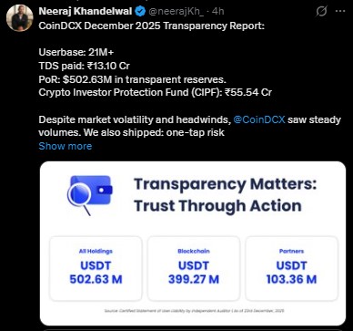 为了进一步支持政府以数据驱动的方式制定政策,CoinDCX 联合创始人 Neeraj Khandelwal 发布了 2025 年 12 月的透明度报告。