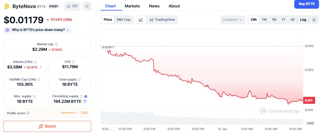 定价方面,可以参考近期上市的、代币供应量相近的代币。例如,供应量为10亿的ByteNova代币,首发价格为0.14美元,但随后价格大幅下跌。根据CoinMarketCap的数据,ByteNova目前交易价格为0.01179美元,盘中跌幅超过57%,市值为229万美元。