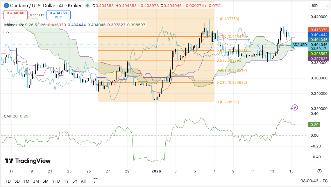 卡尔达诺 (ADA) 4 小时图上的价格走势表明,随着买家守住关键技术位,短期市场状况正在改善。经过数周的横盘整理,ADA 重回 0.40 美元关口,提振了市场对近期走势结构的信心。此次上涨是在价格从近期低点稳步反弹之后发生的,也反映出市场参与度的提高。