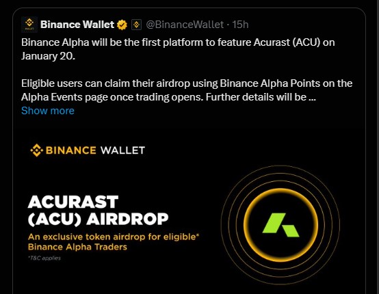 Acurast上市日期已确定为1月20日。币安钱包发布它将成为明天第一个展示该资产的平台。